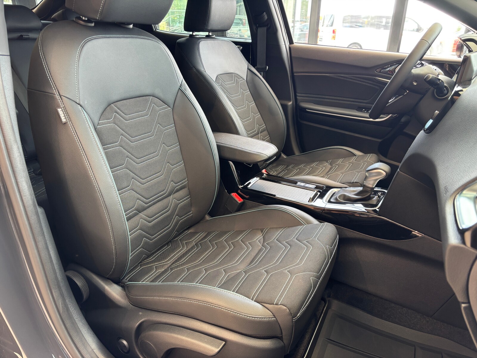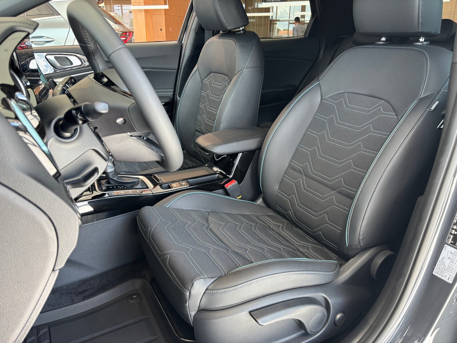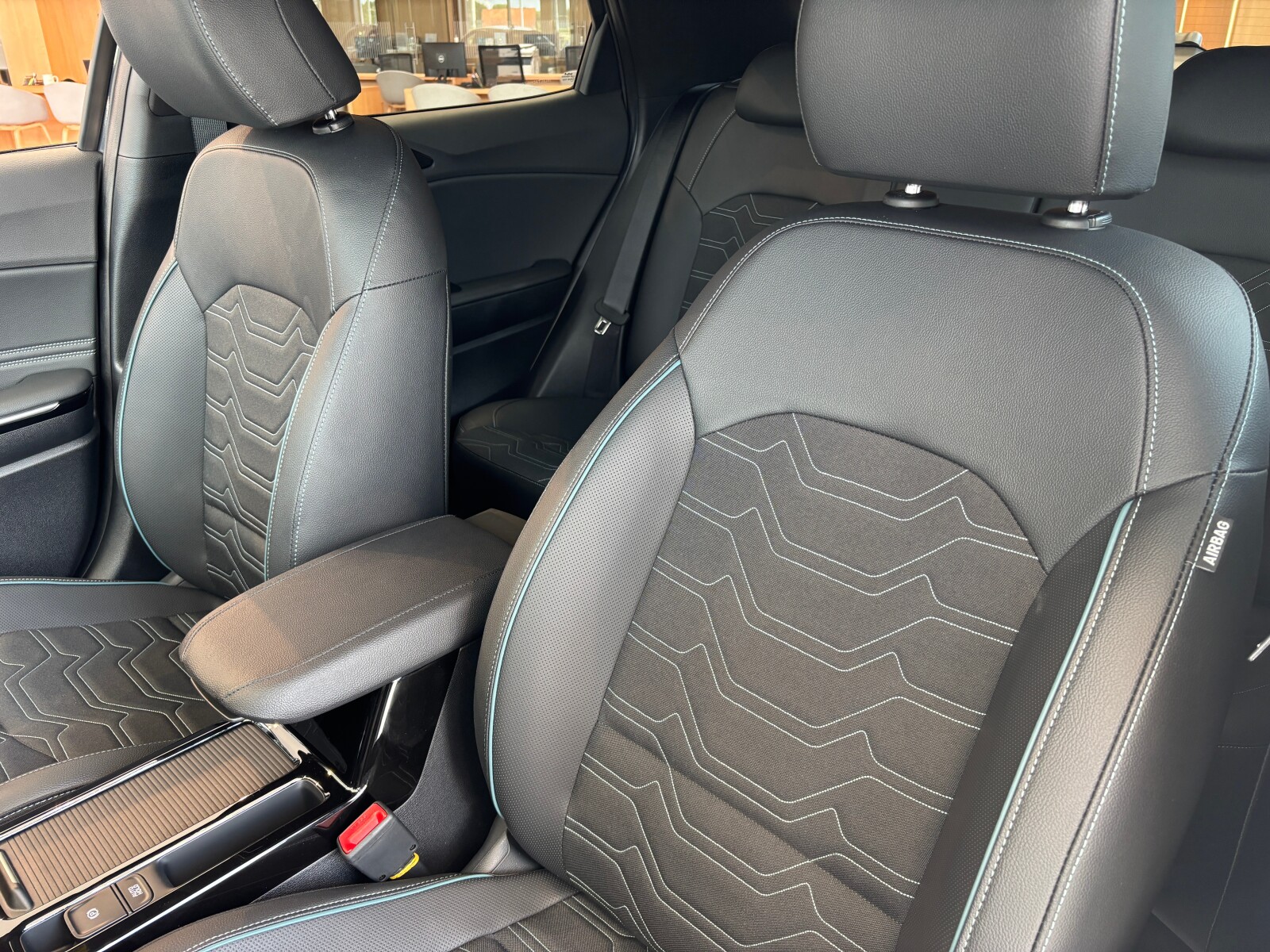 Tapicerka materiałowo – skórzana (skóra syntetyczna) z akcentami stylistycznymi w kolorze oceaniczno – niebieskim